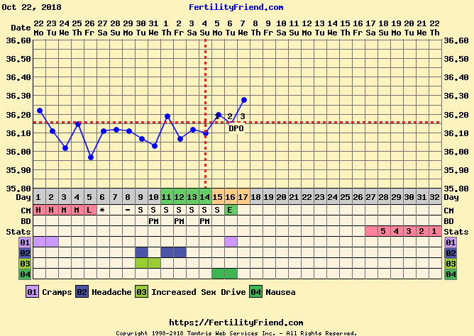 Jeg tempet fem sykluser i fjor. De tre første kom mensen først og temperaturfallet etterpå. Den fjerde kom tempfallet to dager før mensen. Femte syklusen ble jeg på tjukken...