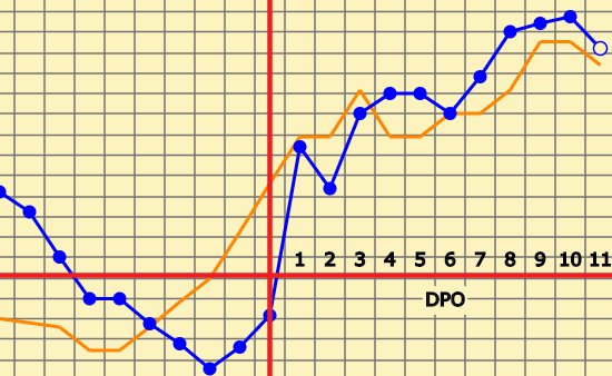 I morgon er det 2 streker og.Søvnen ble fullstendig ødelagt i dag, så tenker at grafen kanskje ikke ser helt riktig ut... Tenker at morgendagen kanskje viser litt mer, og da er jeg jo 12DPO.