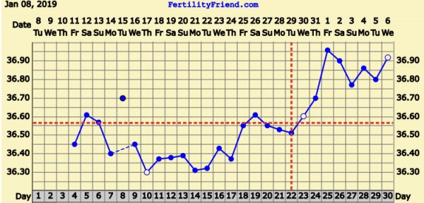 Dagens tempkurver. Siden ff mener jeg har to el-dager legger jeg ut begge. Tror selv jeg hadde EL 24/1, og er 13dpo. Ikke 29/1 og 8. Men hva vet vel jeg. Er ikke til å bli klok på :shifty:. Noen som vet hvorfor den andre EL linjen er stiplet og ikke hel?