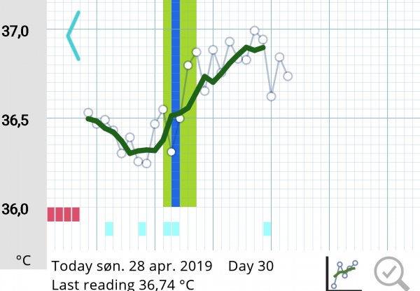 har normalt en syklus på 28 eller 29 dager. Den er jo helt koko fra andre temp grafer
