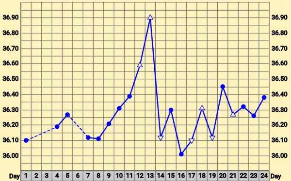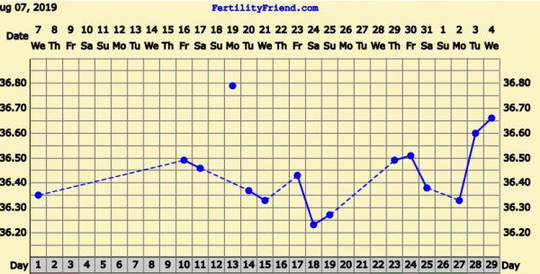 Er ikkje rett Temp må opp i 36,80 og over for at det skal være babykurv. Var den tempen sist gravid. Er begynt og miste håpet.