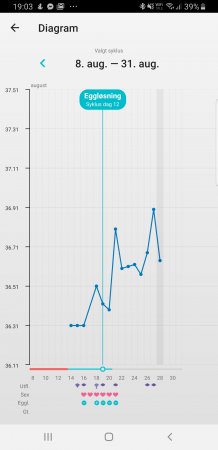 Nei, ikke helt å bli klok på alltid. Ser også nå at jeg har notert at jeg måtte se bort fra det første hoppet hvis det sank igjen dagene etter fordi jeg hadde ligget våken og ventet på å kunne tempe. Men tempen ble jo litt høyere :wacky: Men skal vel være mer stigning for å bekrefte EL tror jeg.