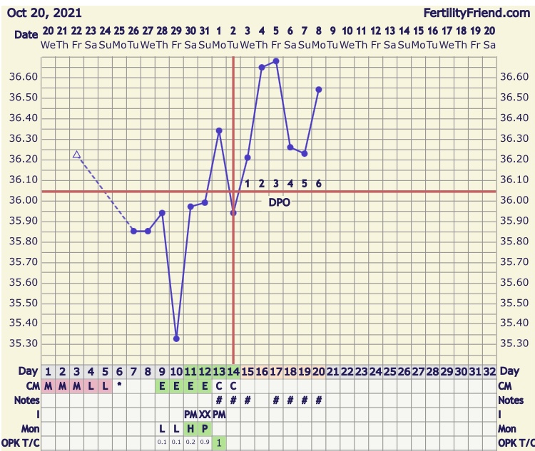Oi, dette var nytt for meg! Det hender mine grafer er sånn. Denne syklusen er jeg veldig usikker på om EL var på CD12 eller 14, men kanskje jeg har hatt en sånn fallback rise 2dpo?