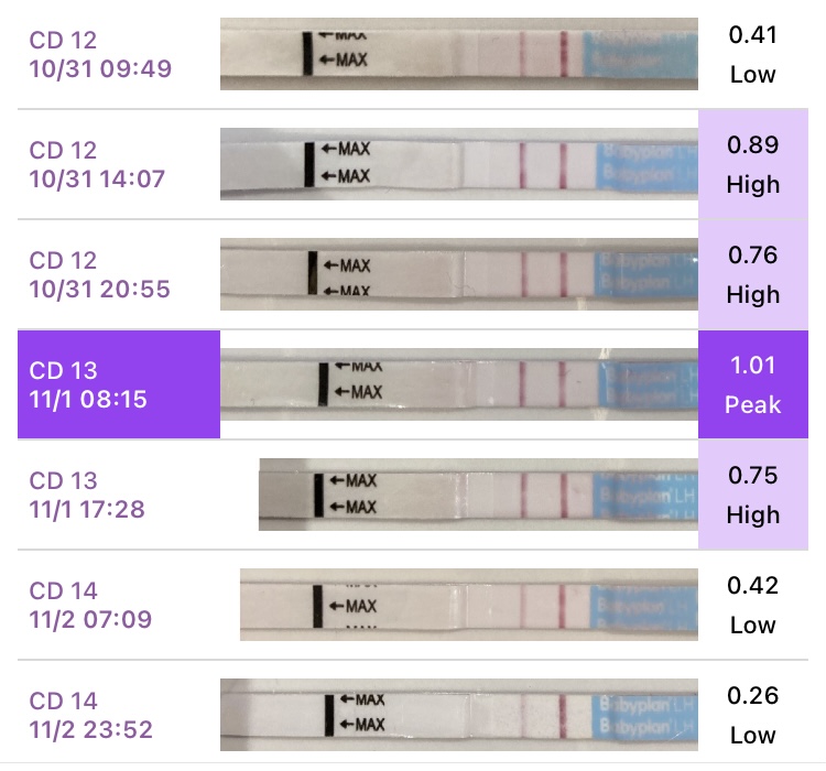Fikk fast smilefjes på Clearblue digital EL-test og hadde el-smerter på C12, så jeg føler det var da. Det var også siste dag med el-slim. Men! Den vanlige babyplan stripstesten var positiv morgenen CD13 (1.01 i Premom). Hvis jeg tar bort den, setter FF krysset på CD12. Men siden testen dagen før var 0.89, så er det godt mulig forskjellen bare kom av mer/mindre konsentrert urin. Setter jeg inn positiv dag 13, sier FF at EL var dag 14.