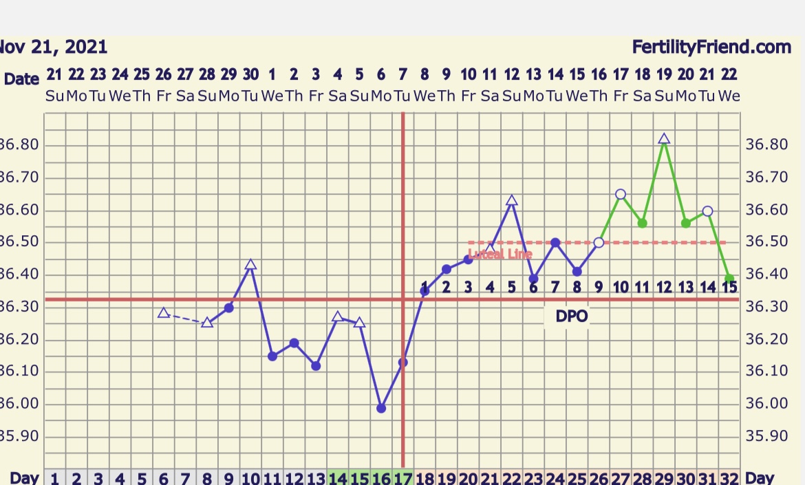 Tempen skikkelig opp idag tidlig! Men fremdeles blendahvit morgentest. Om det var festesmerter jeg hadde kvelden 7dpo og liten festedipp morgenen etter, burde ikke noe slått ut på tester nå? Jeg har kun OneStep-tester fra ebay, men de skal være 10ml...
