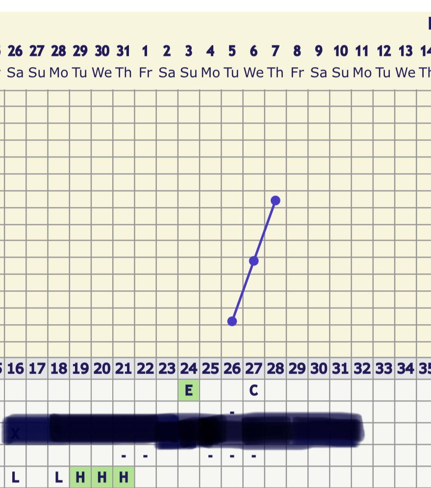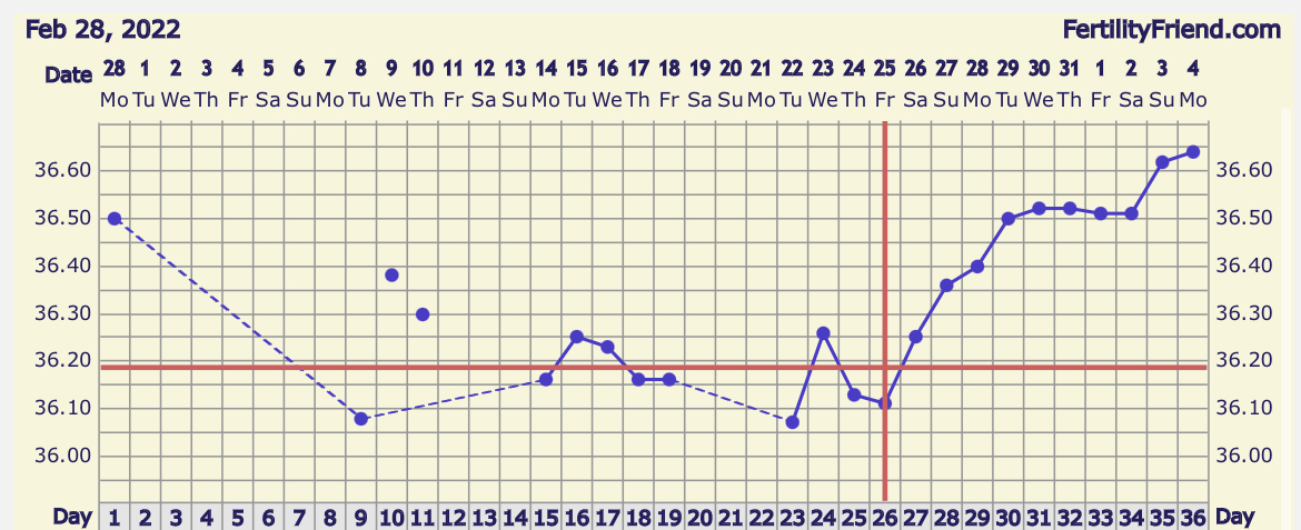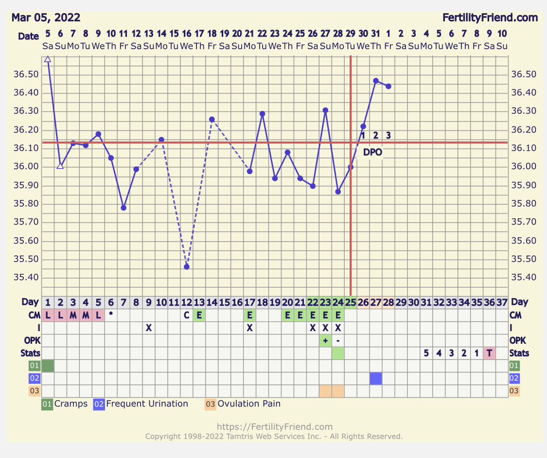 Edit noen timer senere: Lasta ned FF, og den tror jeg er 6 DPO og satte coverline rett under 36, så akkurat som jeg tenkte da![]()