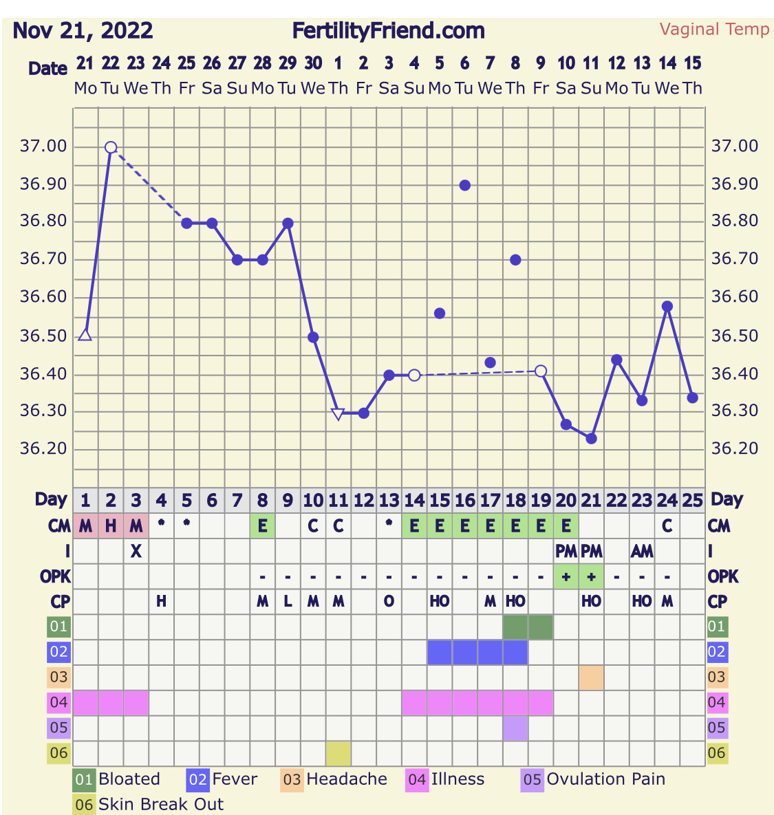 Wtf! Dette tempdroppet var jeg ikke klar for. Vurderer å droppe progesteron og heller håpe neste syklus kommer snart og gir mindre sykdom i hus, for det er ikke videre motiverende å strekke syklusen og gå og vente enda lenger når jeg ikke engang er sikker på at jeg har hatt eggløsning...