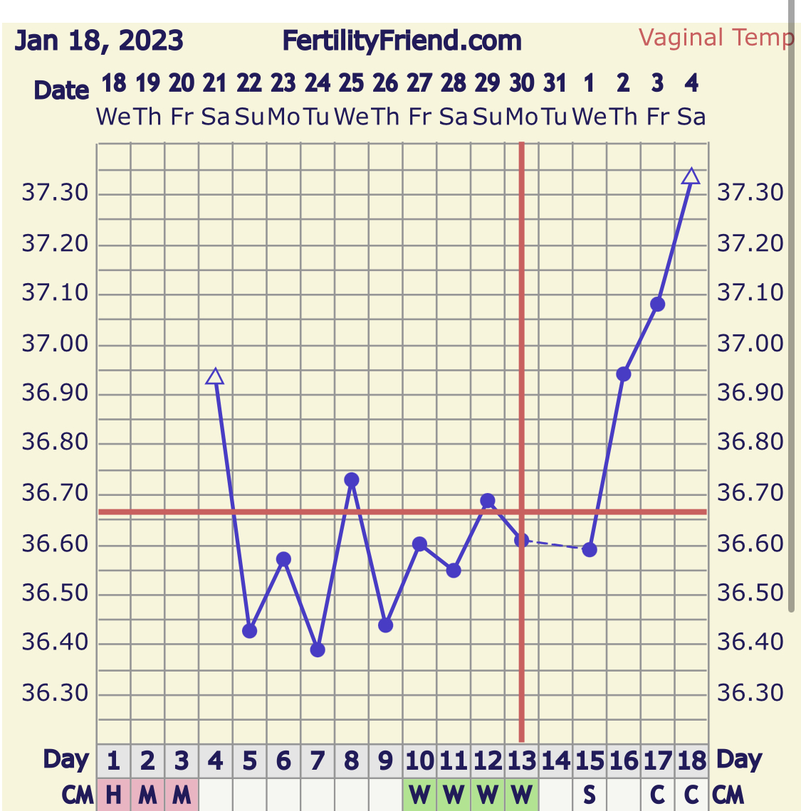 Da holder jeg en knapp på cd19 jeg faktisk. Siden cd20 er den første tempen din som er høyere enn de du har hatt tidligere i syklusen din. Du kan endre tidspunktene på trekantene dine, men tror FF vil slite litt med lite grunnlag. Men du du vil nok få kryss om noen dager, for FF bytter vanligvis over til OPK detektor av seg selv, om ikke kan du gjøre det selv i innstillingene. :thumleft