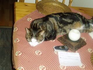 Og her har den sniken lagt seg godt til rette på kjøkkenbordet!![:D]og så sover han på soffan med plddet sitt over seg,har eget pledd,hehe[;)]